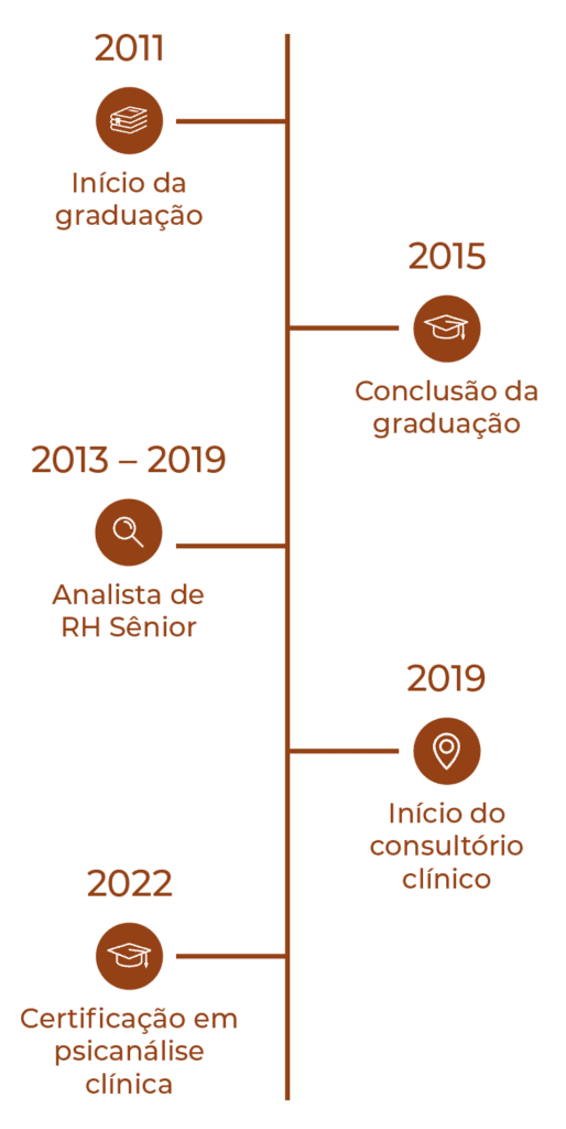 Iniciei minha graduação em psicologia em 2011 pela Universidade de Jaguariúna, me formando em 2015. Em 2022 conclui a certificação em psicanálise pelo IBPC (Instituto Brasileiro de Psicanálise Clínica) e me considero uma psicanalista em contínua formação, seguindo o tripé de análise pessoal, estudo da teoria e supervisão clínica, com o compromisso de sempre ampliar meus conhecimentos e oferecer o melhor atendimento possível a tantas pacientes queridas que passam e já passaram por mim.