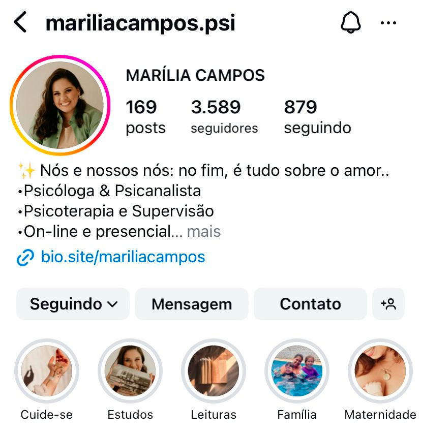 Meu nome é Marília, mas, gosto do jeito carinhoso que as pessoas me chamam de Má. Sou psicóloga clínica, mas não só isso. Sou também tantas outras coisas: mulher, mãe, filha, esposa, amiga. Entendo que minhas relações, minha história, aquilo que vivi e aquilo que escolho viver me transformam e me constroem o tempo todo.